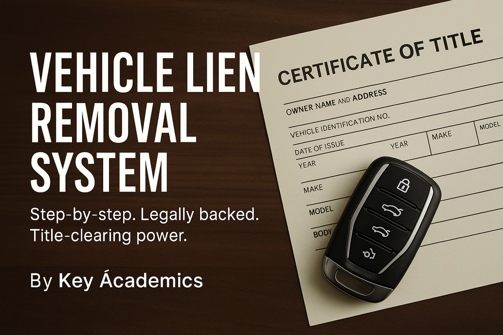 This powerful step-by-step ebook teaches you how to legally remove a lien from your vehicle without paying it off in cash. Backed by real contract law, federal statutes, and commercial code, this guide walks you through the full process, from notice to clean title in hand. Includes all the documents you need to take action, plus detailed instructions that work in all 50 states. Created by Key Âcademics to empower you with knowledge, remedy, and results.